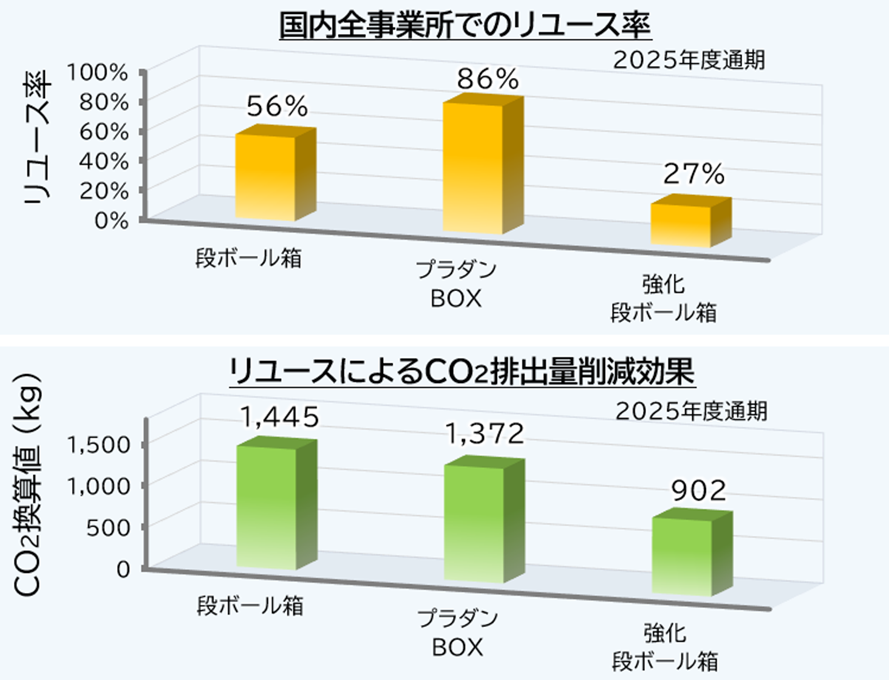 | 当社は、ロジスティックスにおいて、梱包材のリユースや海外グループ会社への製品出荷の集約など、環境負荷を低減する取り組みを積極的に推進しています。 2024年度は、これらの成果をCO2量に換算してCO2排出量削減への貢献の大きさを把握し、他のロジスティックスの取り組み情報に加えて社内に発信しています。 梱包材のリユースに関しては、前年度作成したSDGsシールの活用や、CO2削減量イメージを加えて成果を周知するなどし、リユース率向上に取り組みました。また、海外グループ会社への集約出荷では、2024年度は依頼件数の6.7%を集約し輸送件数を削減しました。 ロジスティックスにおきましては、梱包材のリユースや集約出荷に加え、エコ梱包、廃棄物削減、作業性改善等にも引き続き取り組んでまいります。 |