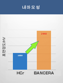 하드 크롬의 코팅 1050HV보다, 반세라는 2440HV과 표면 경도가 2배 이상 높고 마모성이 뛰어납니다.